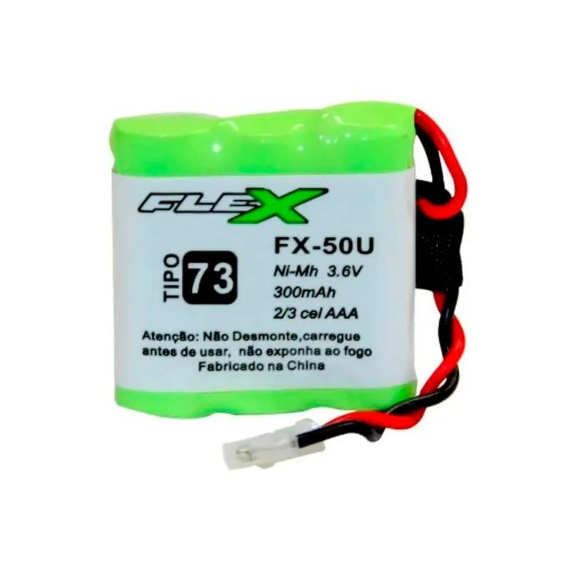 A Bateria Flex FX-50U é projetada para telefones sem fio, oferecendo compatibilidade com diversos modelos devido ao seu plug universal. Composta por três células 2/3 AAA de Níquel-Metal-Hidreto (Ni-MH), ela fornece uma tensão de 3,6V e uma capacidade de 300mAh.