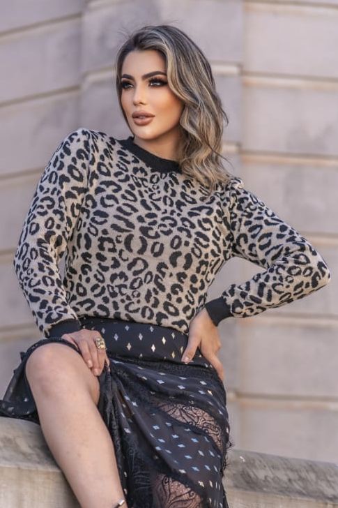 Blusa manga longa confeccionado em tricot. Possui detalhe animal print Onça. Peça charmosa e perfeito para os dias mais frios.