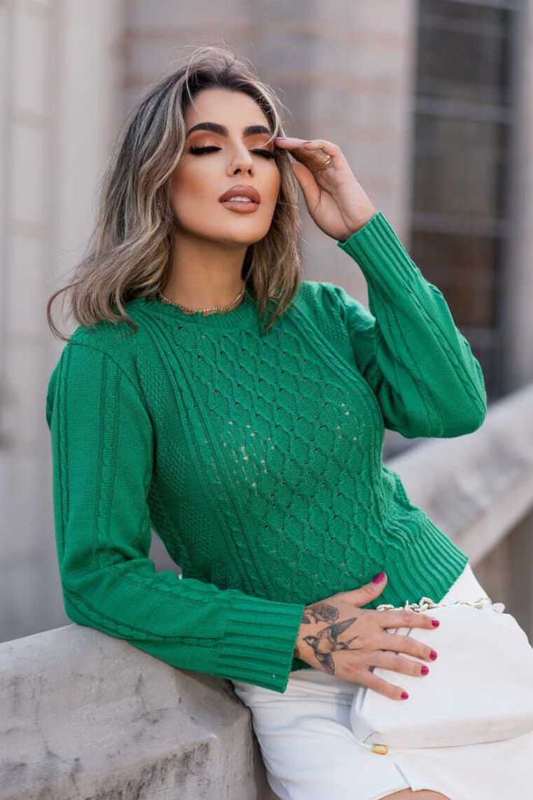 Blusa confeccionada em tricot. Com detalhe trama trançada. Possui mangas longas,. Super confortável e charmosa. Ideal para os dias mais frios.