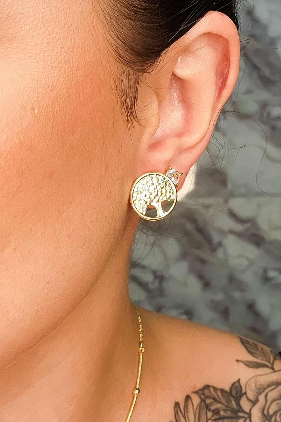 Este brinco apresenta o símbolo da árvore da vida em chapa, banhado em ouro 18k. O design simbólico e significativo adiciona um toque de espiritualidade e estilo ao seu visual. Ideal para quem busca uma peça única e cheia de significado, perfeita para uso diário ou para presentear alguém especial. O símbolo da árvore da vida representa crescimento, conexão e harmonia, enquanto o acabamento em ouro 18k confere brilho e durabilidade.