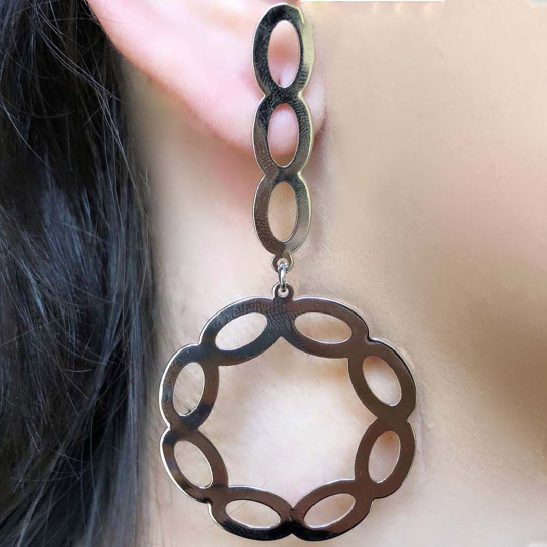 O Brinco Grande com Fio e Círculo com Arcos Vazados é um acessório atemporal que se encaixa bem em qualquer ocasião e em qualquer composição. Uma peça luxuosa com um design exclusivo.