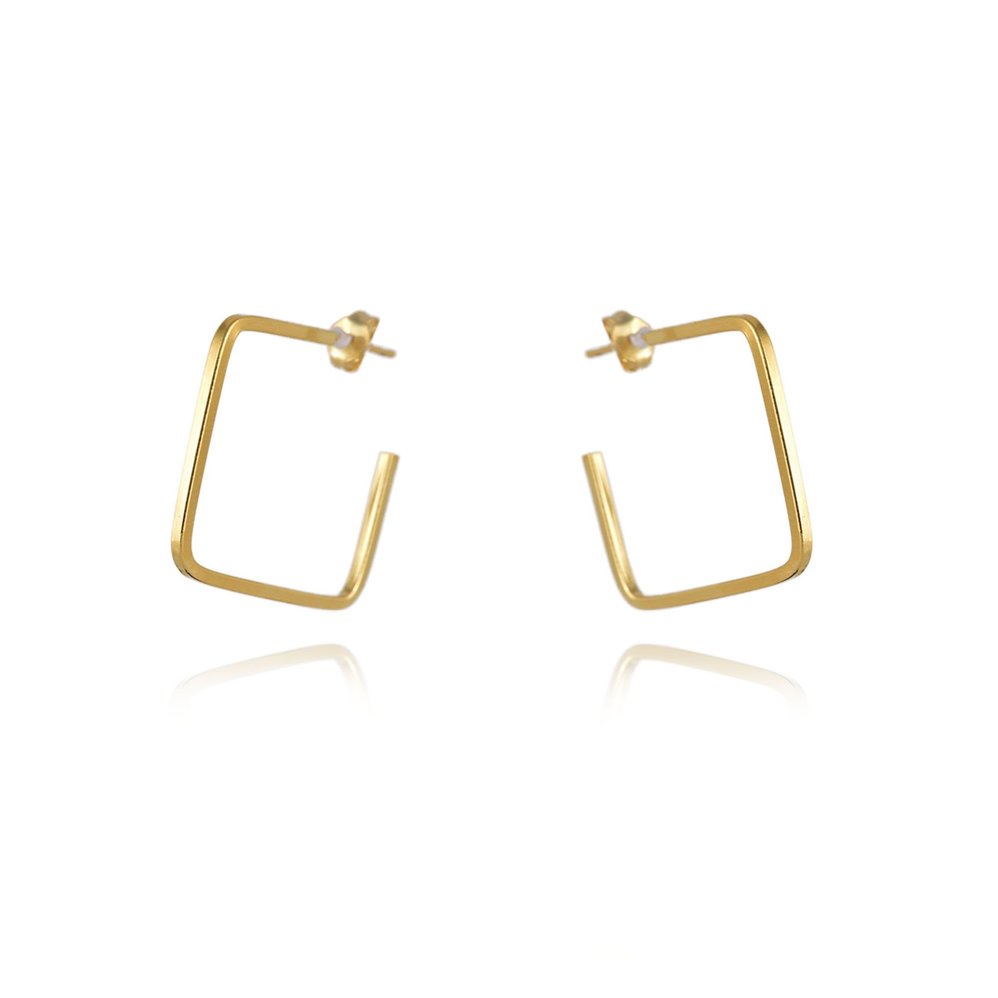 Essa peça especial é um brinco de argola de tamanho pequeno que possui um quadrado vazado e todo folheado a ouro 18k.