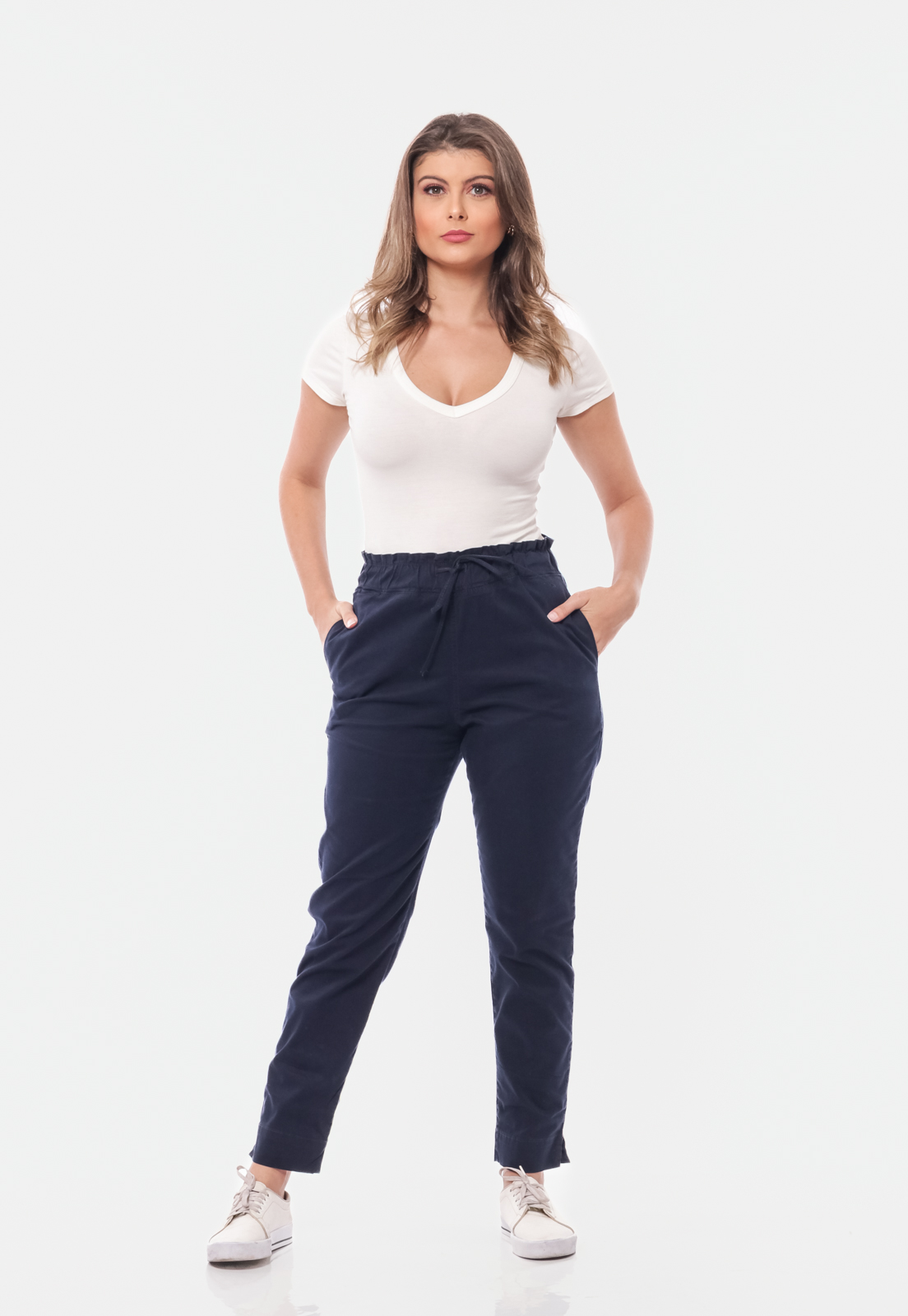 Essa calça com elástico no cós é nossa proposta pra o máximo de conforto que uma calça de sarja pode proporcionar.