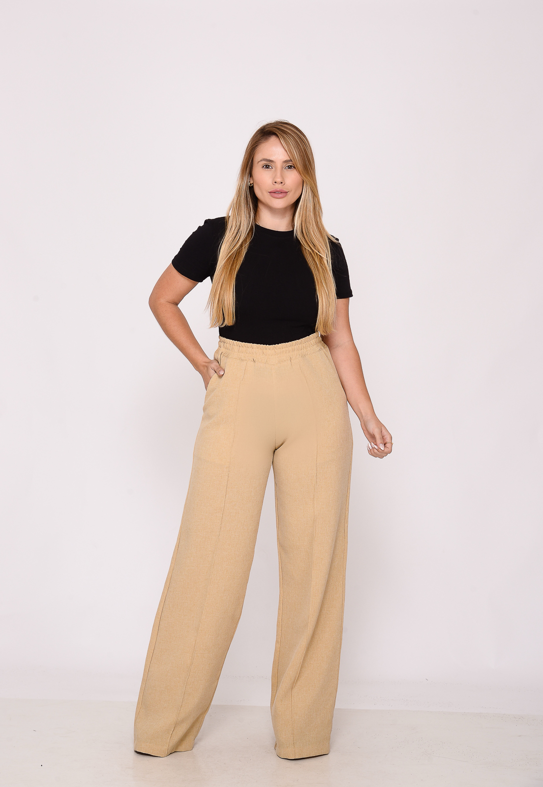 Calça Feminina com Elastico na cintura, bolsos faca frontal, ótimo comprimento.