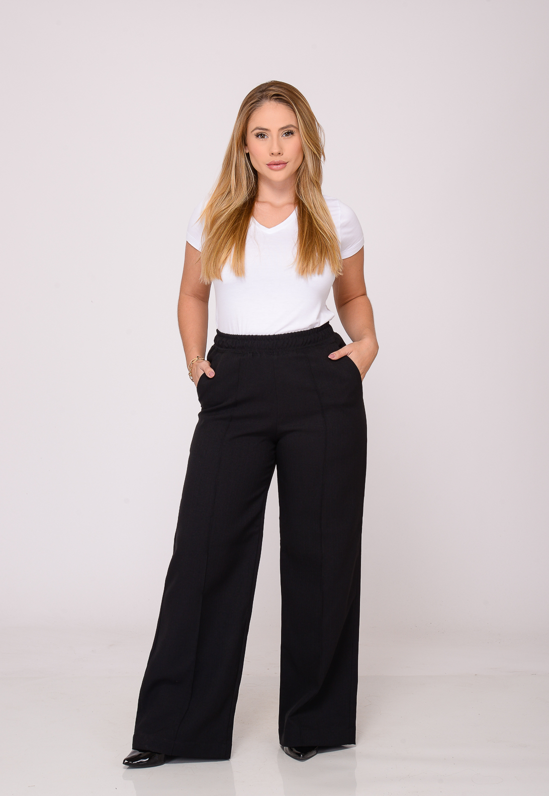 Calça Feminina com Elástico na cintura, bolsos faca frontal, ótimo comprimento.