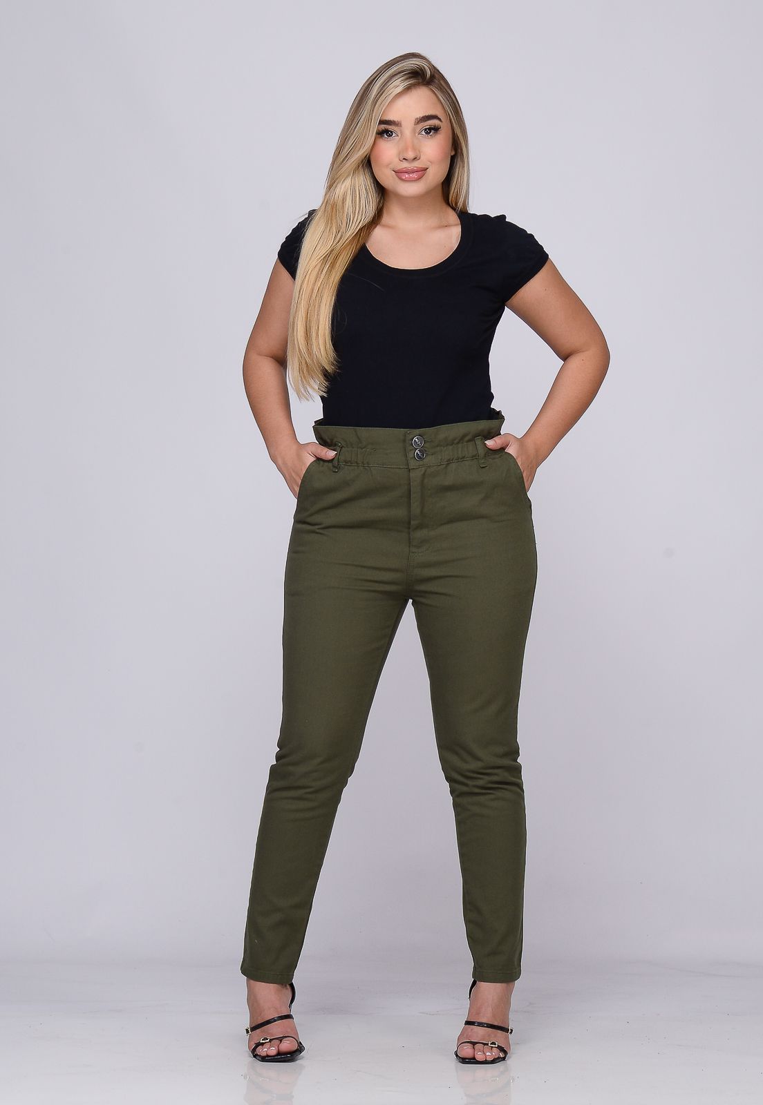 O modelo Clochard possui cintura alta, com elástico e passante no cós, com botão e ziper frontal e bolsos frontais.