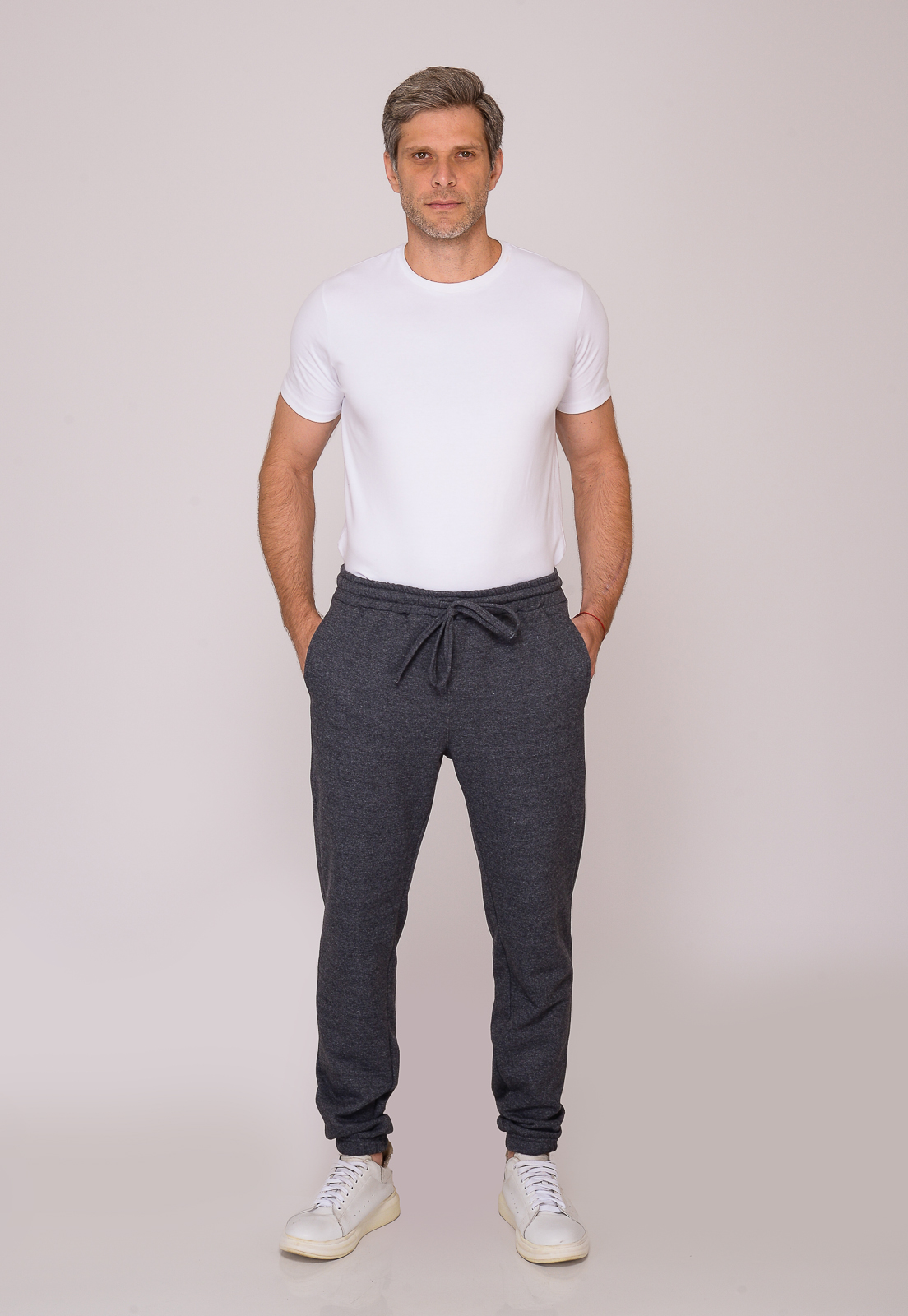 A composição do tecido usado na confecção dessa calça mistura fibras de algodão junto com o poliéster.