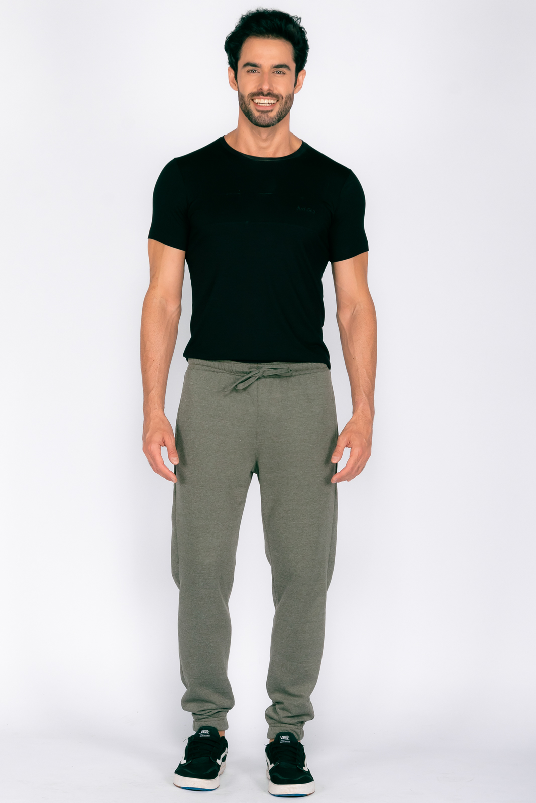 A composição do tecido usado na confecção dessa calça mistura fibras de algodão junto com o poliéster.