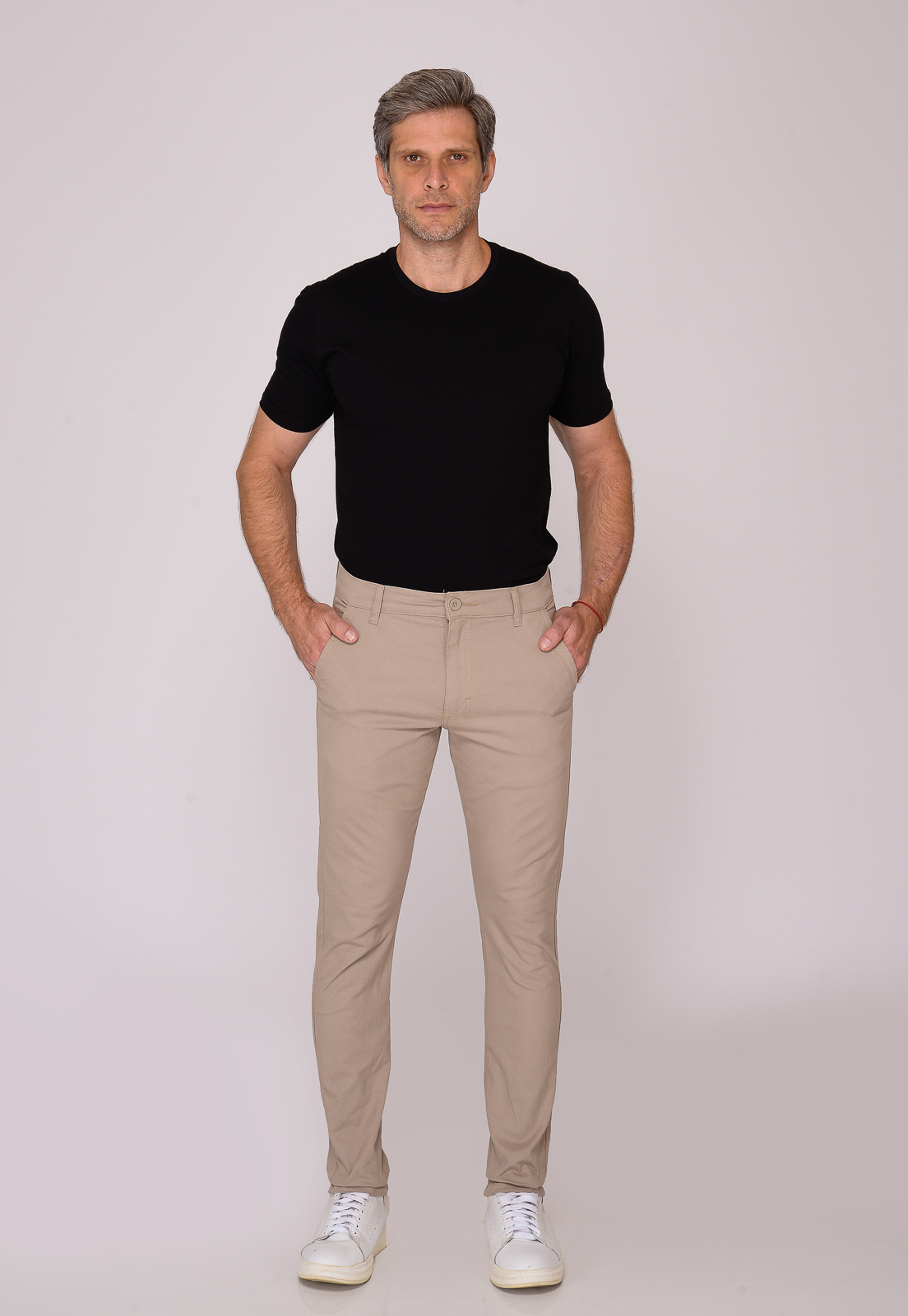 A composição do tecido usado na confecção dessa calça mistura fibras de algodão, que permite tingirmos em qualquer cor e garante toque macio, e o elastano, que dá mobilidade e conforto.