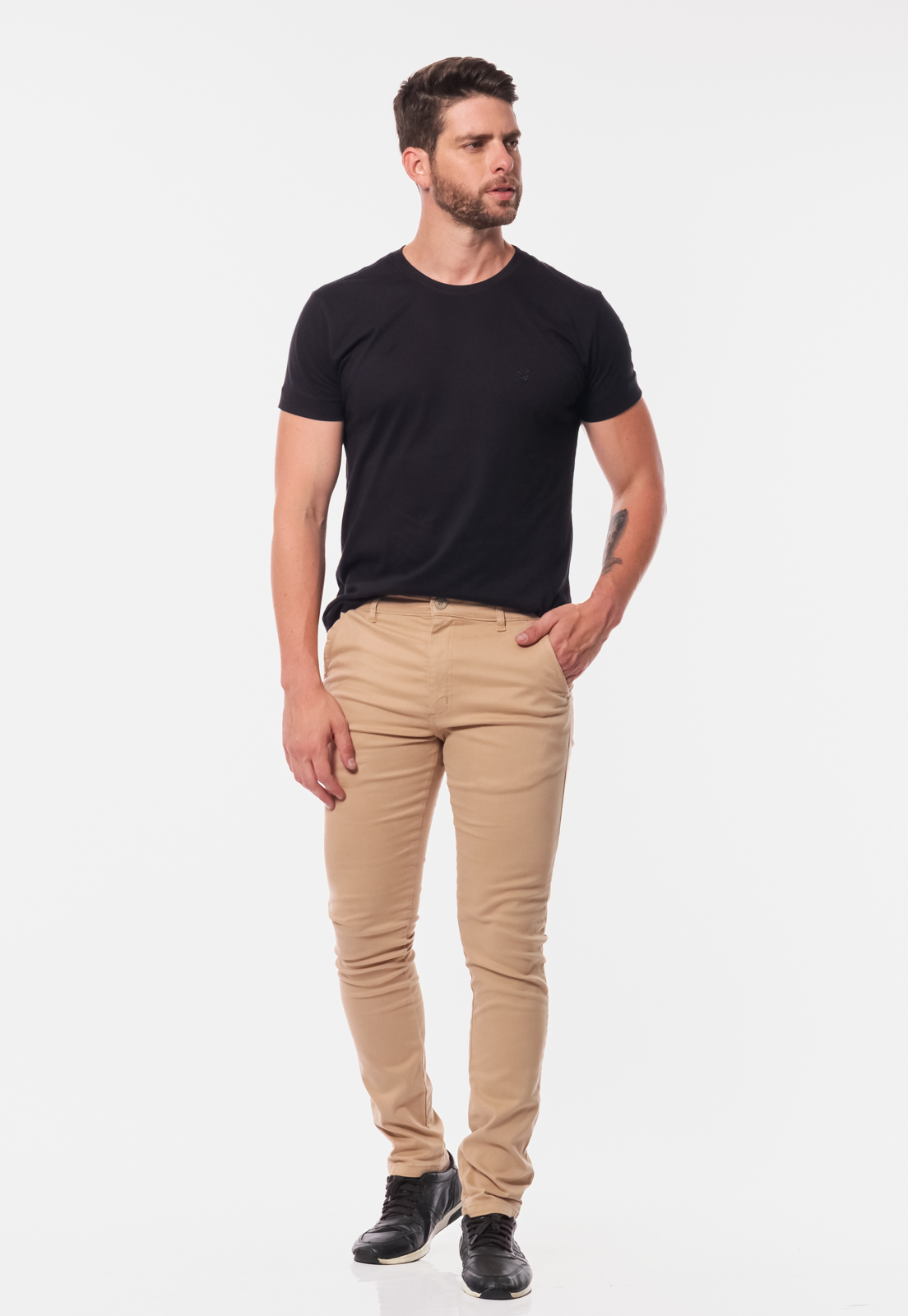 A composição do tecido usado na confecção dessa calça mistura fibras de algodão, que permite tingirmos em qualquer cor e garante toque macio, e o elastano, que dá mobilidade e conforto.