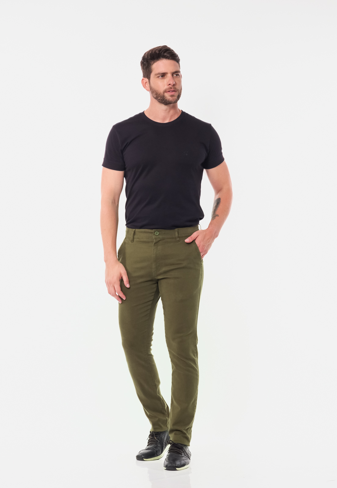 A composição do tecido usado na confecção dessa calça mistura fibras de algodão, que permite tingirmos em qualquer cor e garante toque macio, e o elastano, que dá mobilidade e conforto.