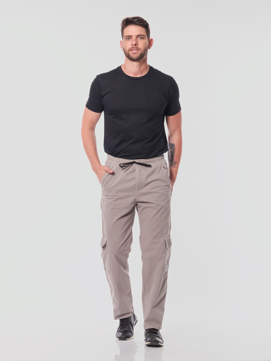 Calça sarja, modelagem mais larga, maior conforto.