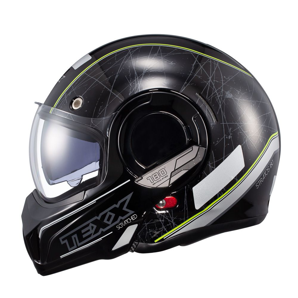 O capacete TEXX Stratos 180° Scratched apresenta casco aerodinâmico e frente modular.
