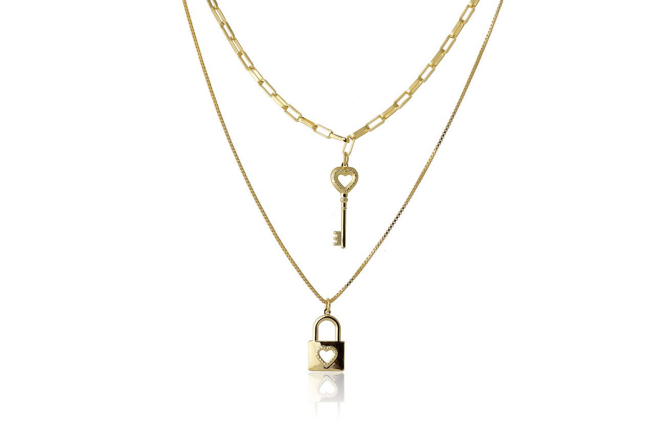 O colar duplo com corrente cartier e pingente de chave é uma peça sutil e perfeita para elaborar seus looks delicados. Composto por um pingente de chave com o acompanhamento da segunda corrente Cartier esse colar folheado em ouro 18k é indispensável para uma presença marcante. Com duas correntes em um único colar, o look já fica completo com apenas uma peça.