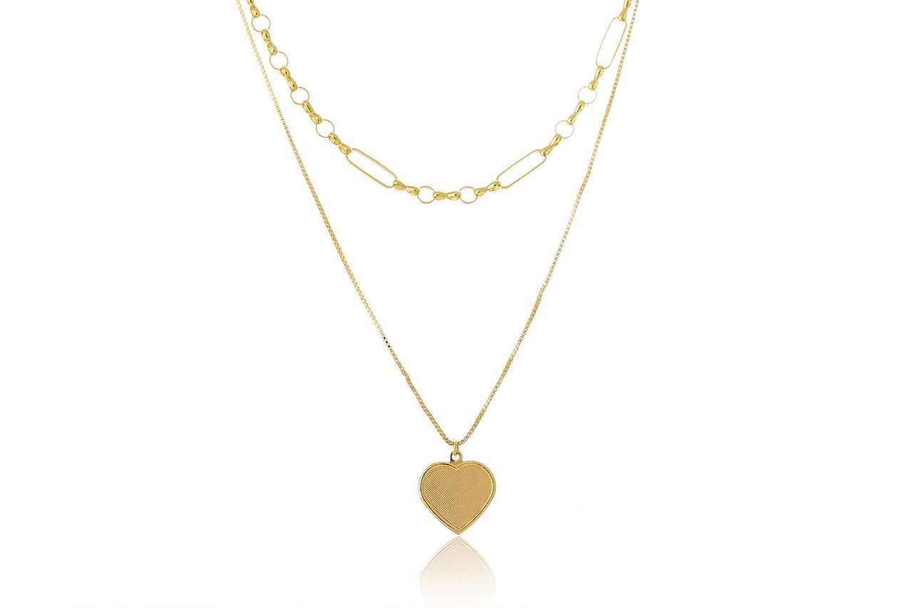O colar duplo folheado em Ouro 18k com Coração é apaixonante e envolvente! Esse colar é compor por uma corrente trabalhada e na outra temos um coração chapado.