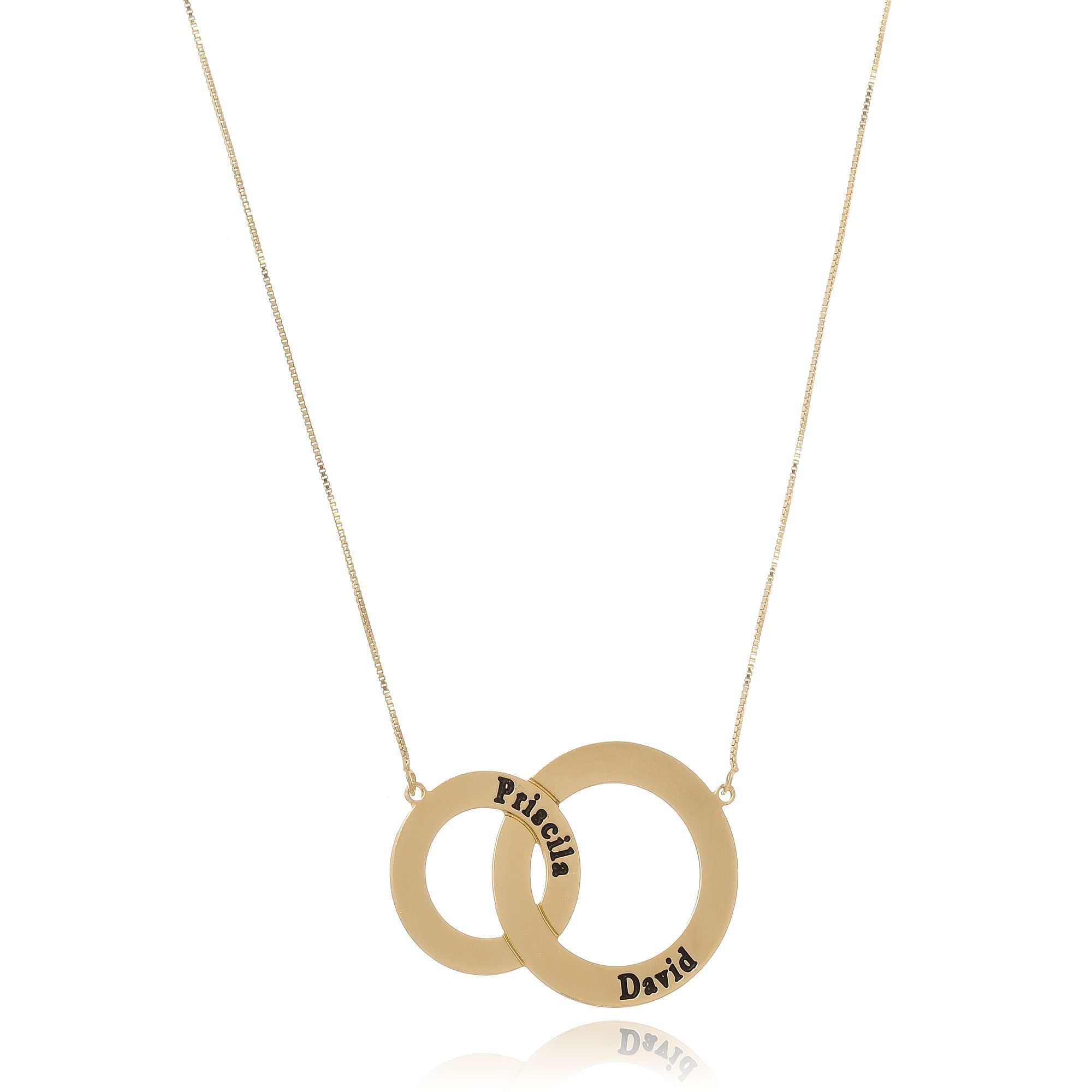 Um lindo modelo de colar personalizado de círculos entrelaçados que levam nomes, um verdadeiro encanto de colar