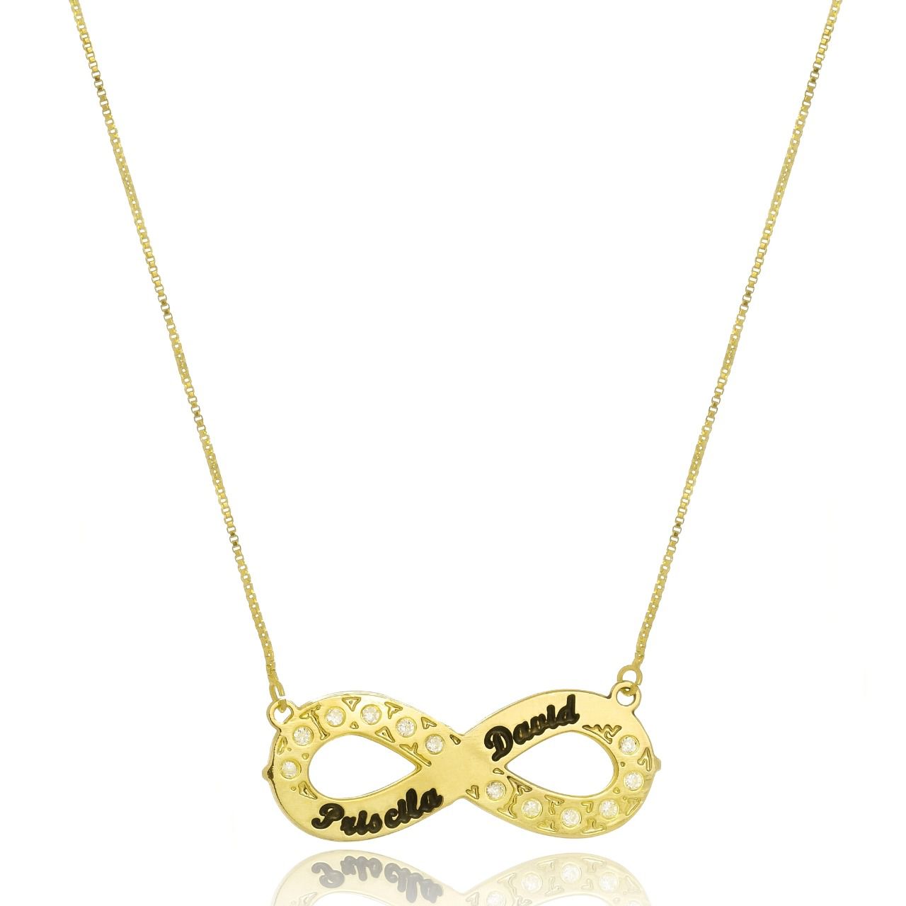 Um lindo modelo de colar personalizado do símbolo do infinito com nomes e detalhes em zircônia, um verdadeiro encanto de colar