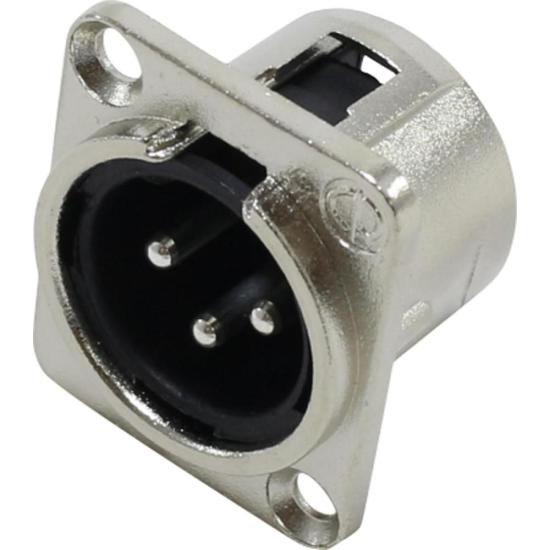 Com corpo metálico em formato "D", que oferece resistência e proteção aos componentes internos. Ele é parte da série de montagem em painel XLR universal, garantindo compatibilidade com diferentes sistemas e equipamentos.