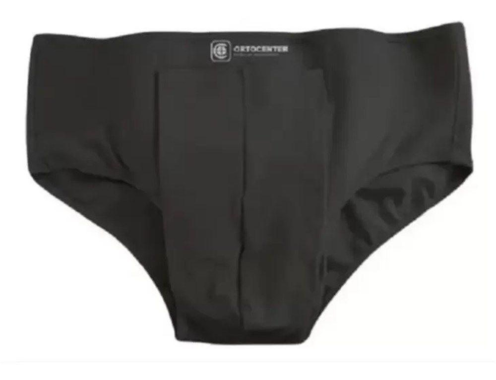Cueca para hérnia inguinal com almofadas removíveis, podendo ser utilizada apenas de um lado ou dupla.