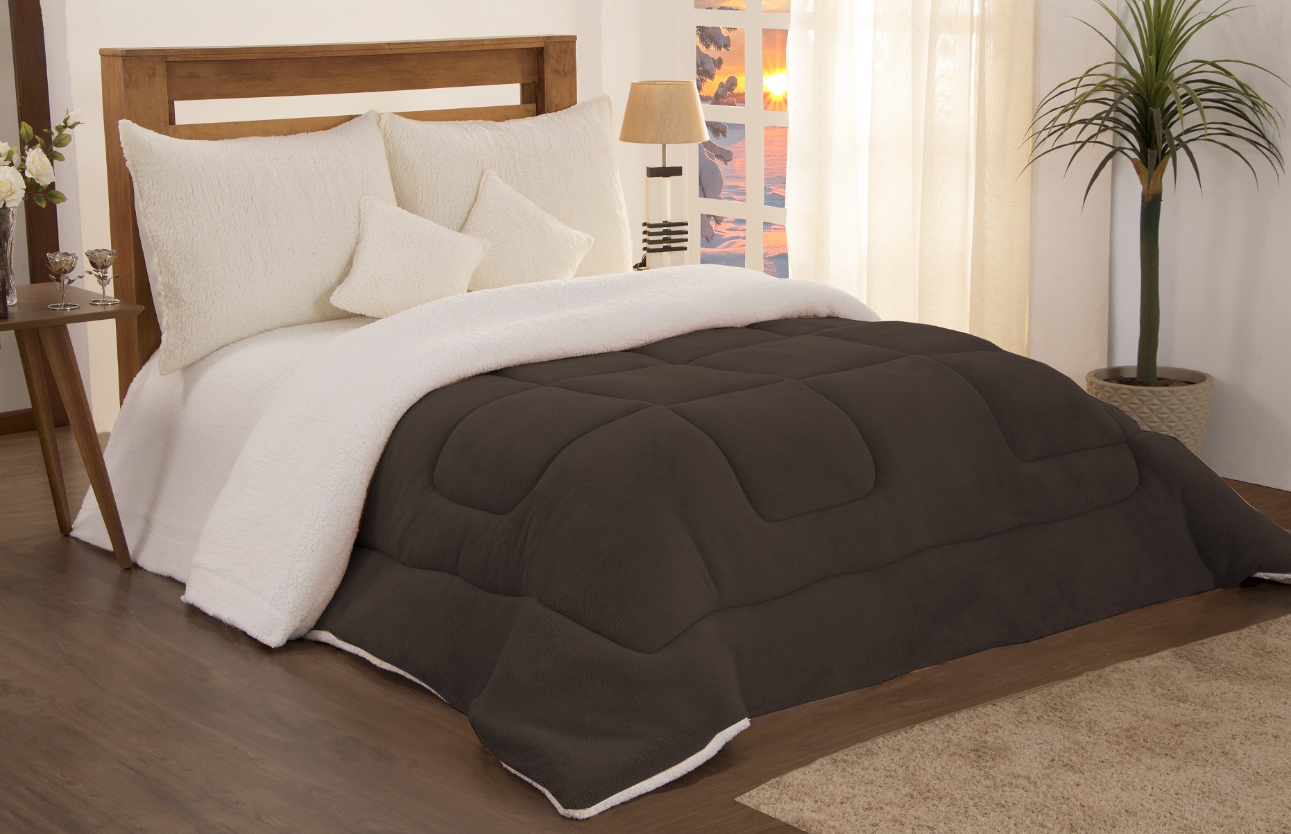 O coberdrom Sherpa é um produto que alia os conceitos de cobertor e edredom, trazendo o melhor de cada um deles em uma única peça, super versátil, o lado superior é feito em tecido dos cobertores de microfibra de poliéster e de plush, trazendo conforto e maciez extrema. Já o lado inferior é feito em Sherpa, um tecido extremamente macio e suave ao toque, no estilo lã de ovelha, na cor crú. A composição de cores torna essa peça perfeita para deixar seu quarto muito mais bonito, elegante e sofisticado. Ideal para tornar sua cama ainda mais aconchegante e aquecida em noites de frio mais intenso.