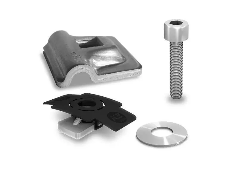 Conjunto próprio para proteção contra raios e aterramento de cabos elétricos de 8mm, e equalização entre painéis e trilhos. Peças próprias de fixação contra raios Multi K2 em alumínio associadas a TerraGrifs® K2SZ em aço inoxidável.