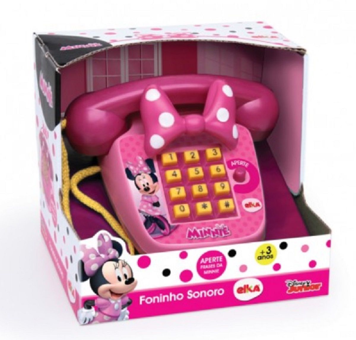 Telefone sonoro com frase da Minnie. Brinque com o fone, aperte as teclas e botão com frase da sua personagem predileta da Disney.