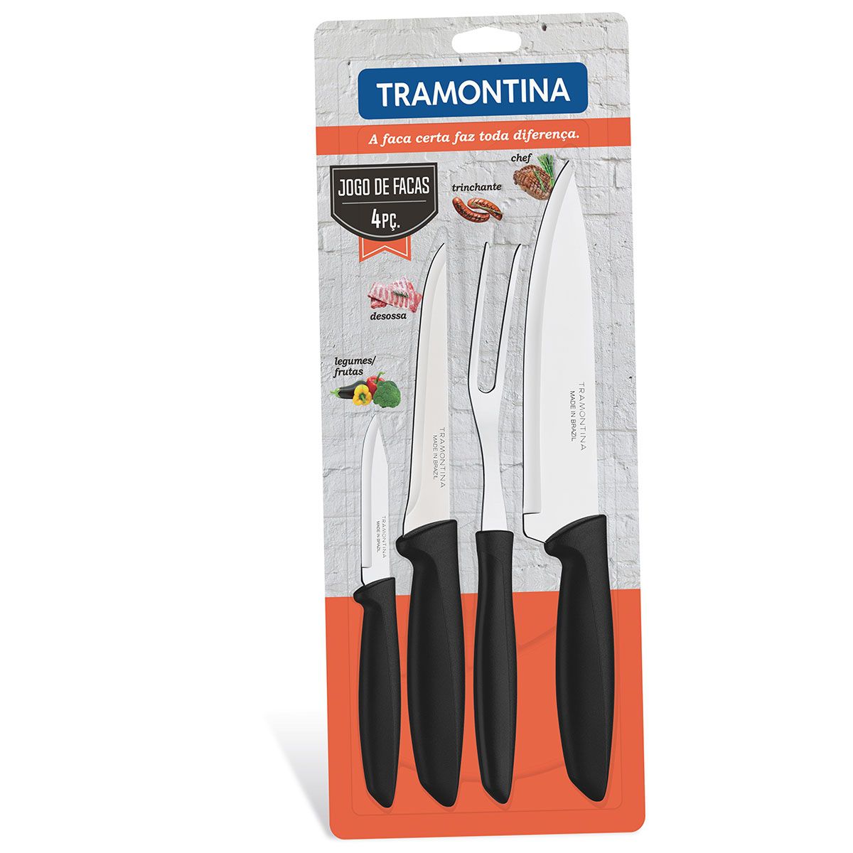 O Jogo de Facas Tramontina Plenus com Lâminas em Aço Inox e Cabos de Polipropileno Preto 4 Peças da Linha Plenus é perfeito para diferentes cortes na cozinha.