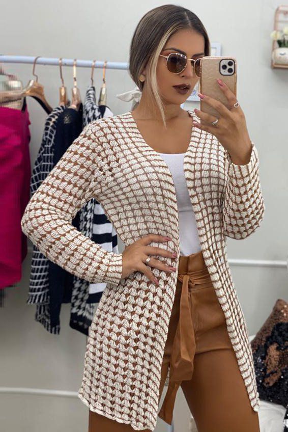Kimono longo confecionado em tricot, de mangas longas. Aberto, não possui fechamento. Na cor bege e fios levemente marrons, possui pequenas aberturas. Macio, estiloso e super confortável.