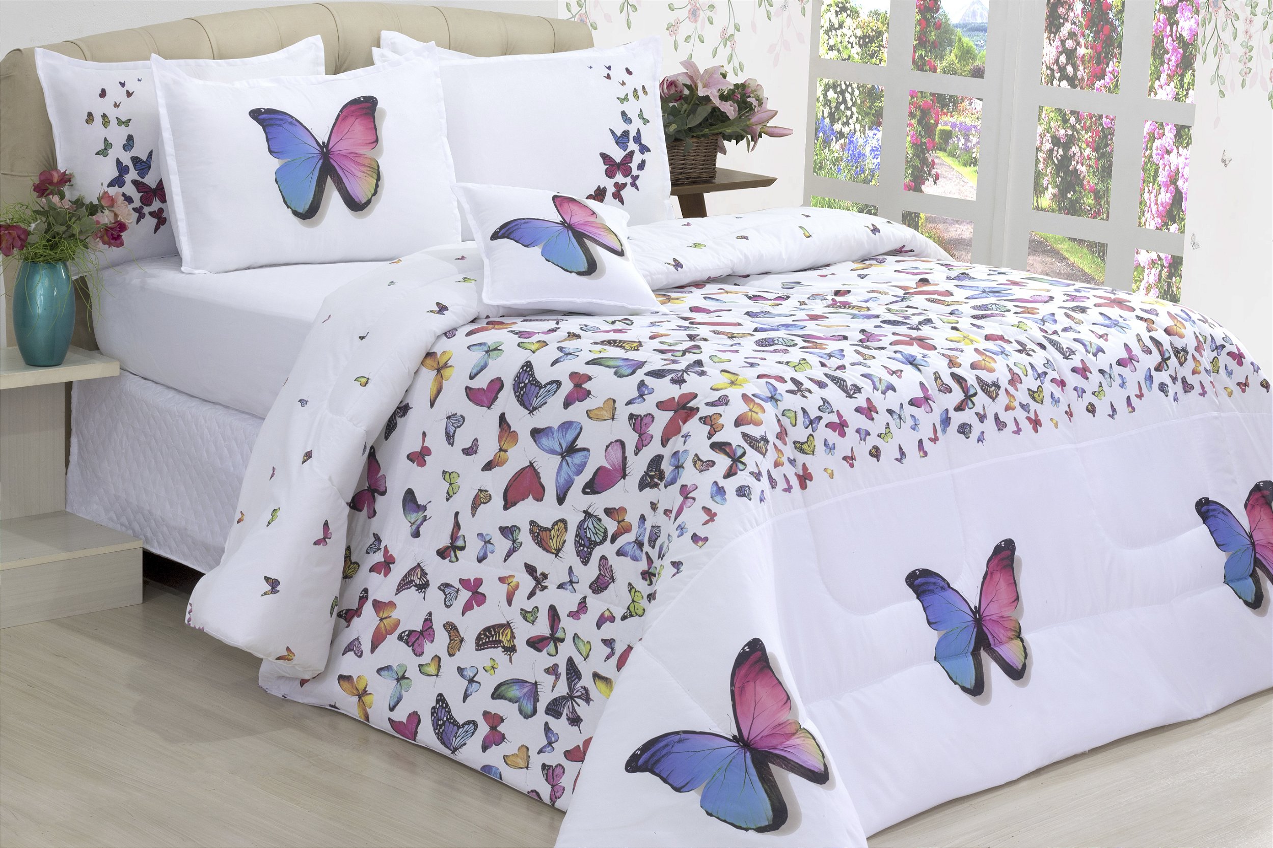 KIT EDREDON BORBOLETAS PERCAL 180 FIOS DUPLA FACE QUEEN SIZE 04 PÇS