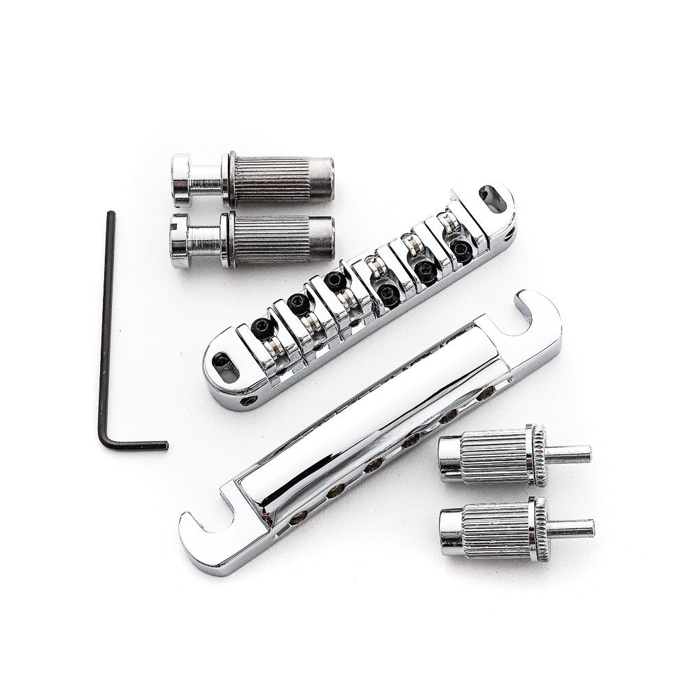 Ponte para Guitarra modelo Les Paul, em acabamento Cromado, Spirit Guitar Parts - BSB-CR/LTZC-TAIL-CR. Em 1954, a Gibson alterou pela terceira vez o design das suas guitarras criando assim a clássica ponte Tune-o-matic. Essa nova ponte possui entonação individual para as cordas mas o ajuste de altura da ponte é geral. O estilo antigo dessas pontes possui dois pinos em formato de roda para ajuste da altura, mas as guitarras modernas possuem um design de ponte Tune-o-matic que se encaixa melhor e possuem os pinos com cabeça no formato para uso de chave fenda. A direção e os tipos de saddles podem ser mudados de acordo com as necessidades do consumidor.