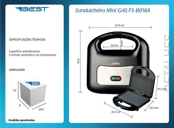 A Sanduicheira Mini Grill Best FS 8816A faz 2 sanduíches de uma só vez em menos de 5 minutos. É ideal para quem quer rapidez e praticidade no preparo dos seu lanche.