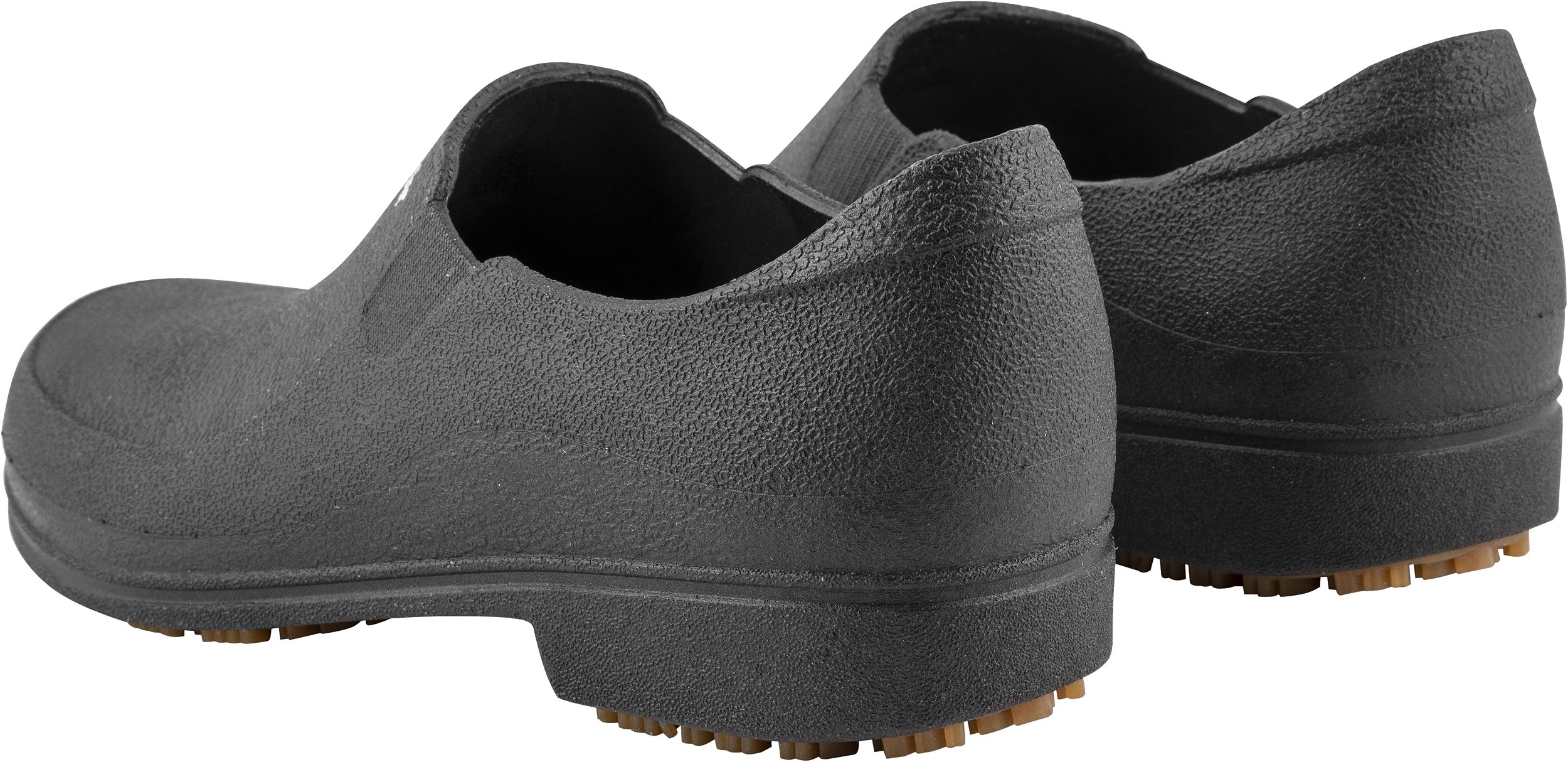 Sapato fechado na parte do calcanhar e na parte superior. Confeccionado em material polimérico e impermeável. Conta com palmilha interna removível, absorção de energia na área do salto, solado de borracha antiderrapante resistente ao óleo combustível, ao escorregamento em piso cerâmico com solução de detergente e em piso de aço com solução de glicerol.