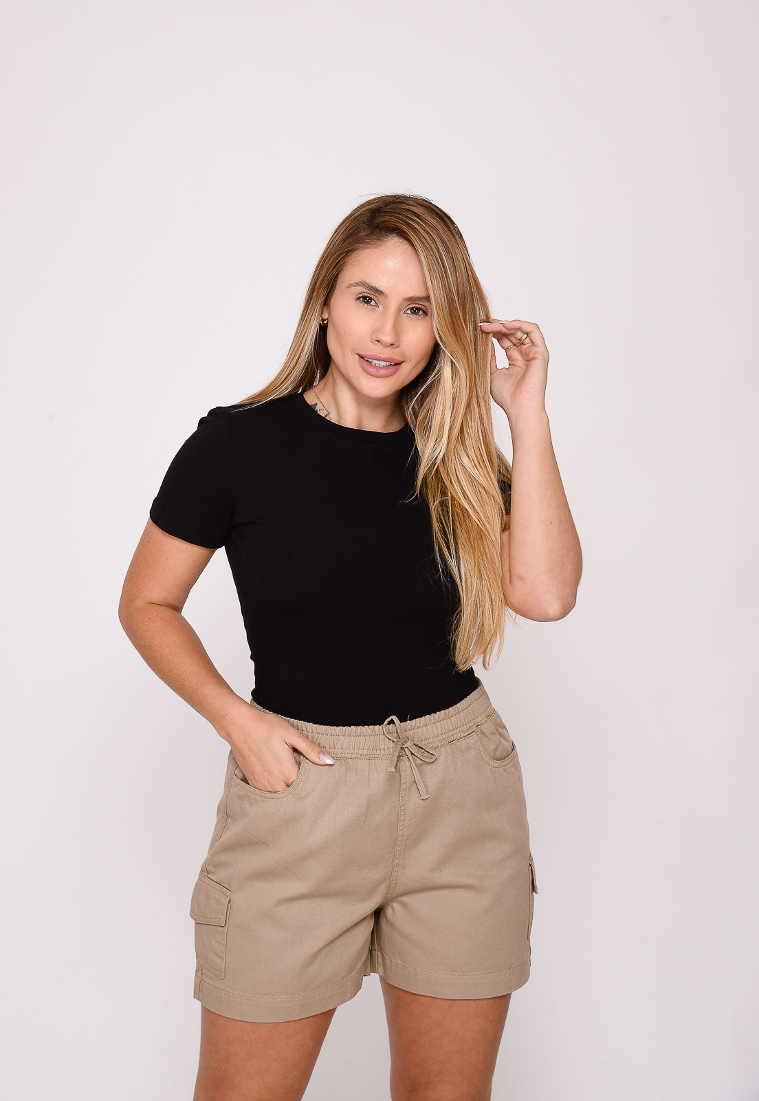 Com elástico na cintura, contém cordão frontal somente para enfeite, 2 bolsos frontais modelo concha, 2 bolsos laterais cargo.
