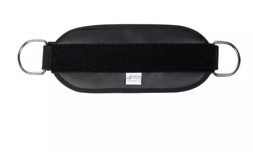 Material: Neoprene revestida em courvin com acabamento em viés e argolas em aço cromado, transpassada em fita de polipropileno 40mm.