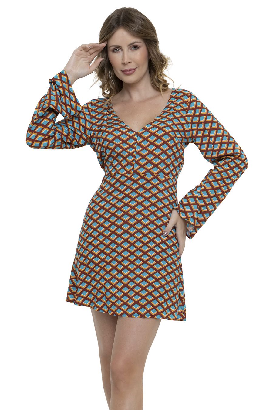 Vestido curto feminino de mangas flare. Confeccionado em viscocrepe, tecido de caimento leve e confortável. Sem bojo, decotado, possui fecho em botão e zíper invisível posterior, com forro na saia, em estilo flare. Com estampa geométrica de cor azul. Charmoso e elegante.
