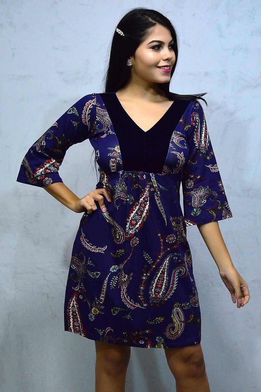 Vestido Curto Viscolycra Mangas Flare Paisley Azul